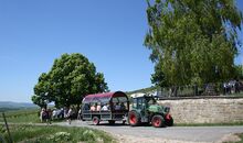 Nach einem prickelnden Begrüßungsschlückchen starten wir vom Weingut aus mit gekühlten Getränken (Wasser und Traubensaft). Die Fahrt führt euch durch die Straßen und den alten Ortskern Gau-Bickehlheims, den Kreuzweg hinauf bis aufs Wißbergplateau (Golfplatz mit Golfhotel). Dort steigt ihr vom Planwagen und genießt die tolle Aussicht